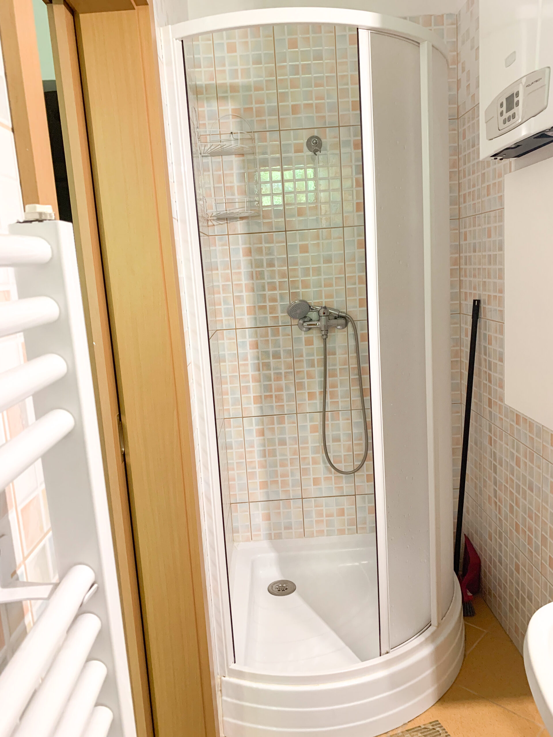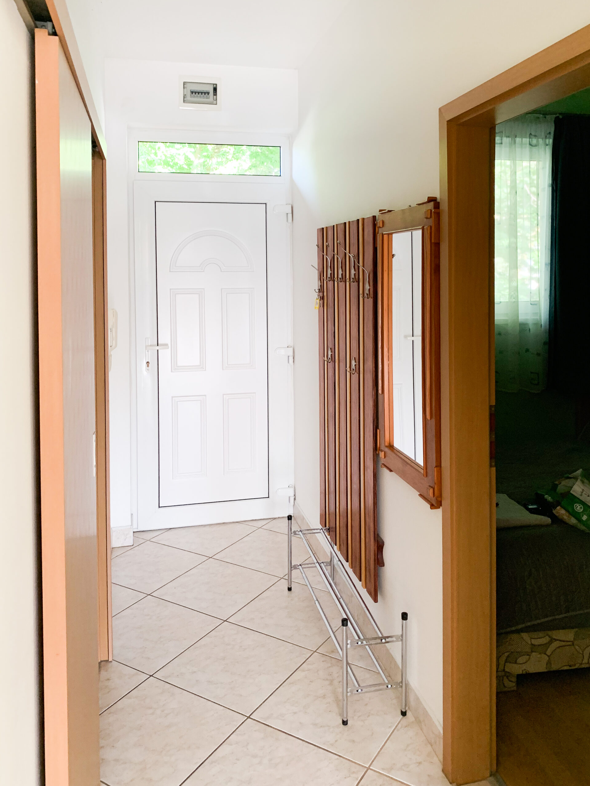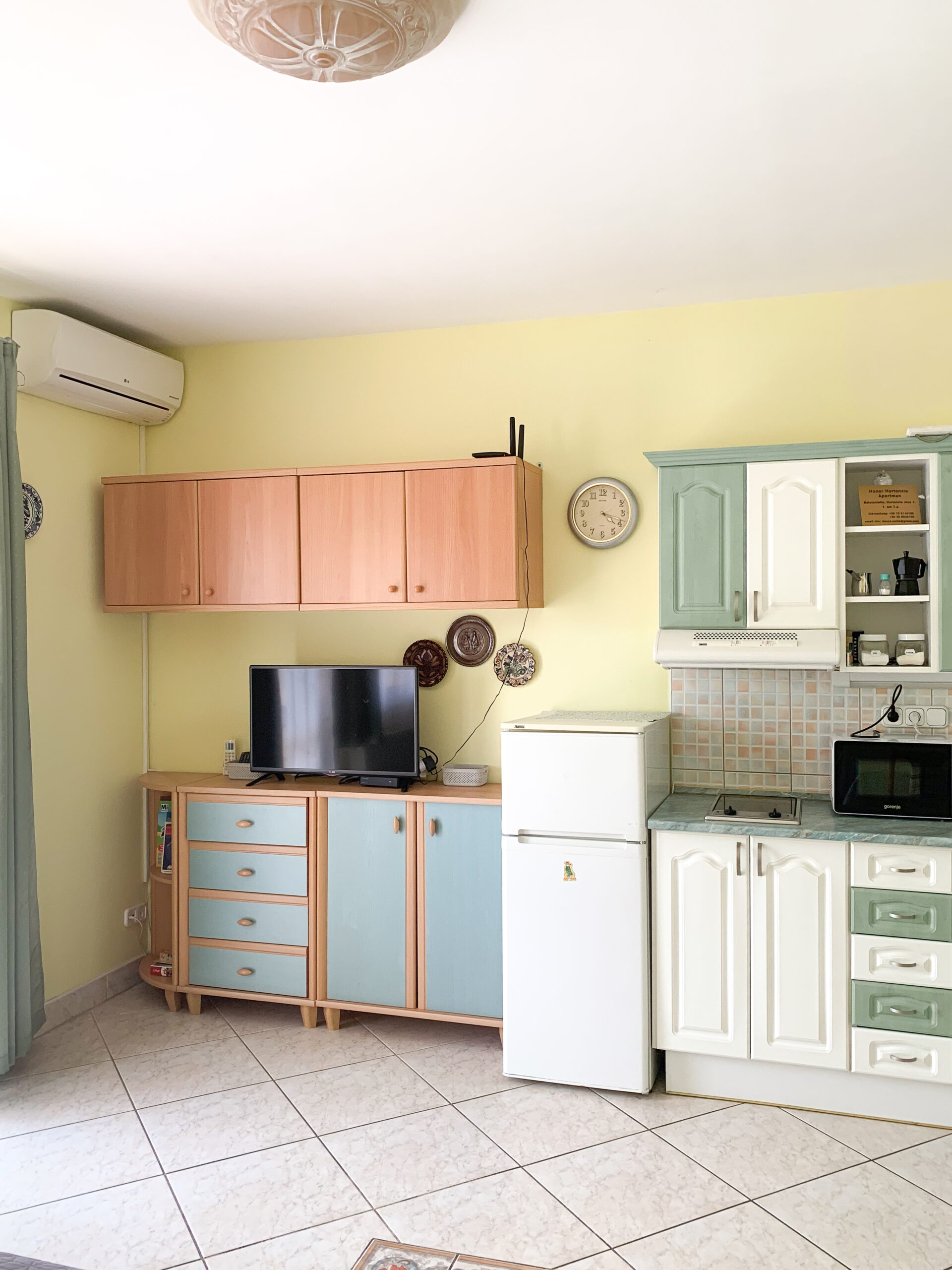 Die Wohnung ist aufgeteilt in ein Vorzimmer mit Shrank, ein Badezimmer mit Badewanne + wc, Schlafzimmer mit Doppelbett, Wohnzimmer mit Kanapee (ausziehbare Couch), zusammen mit der Küche, Tisch + 4 Stuhl, Fernsehen, wo auch eine Klimaanlage eingebaut ist. Die Küche ist mit Geräten und Teller, Gläser, Geschirr, Gasherd, Mikrowelle, Kaffeemaschine, Toaster, Wasserkocher ausgestattet.